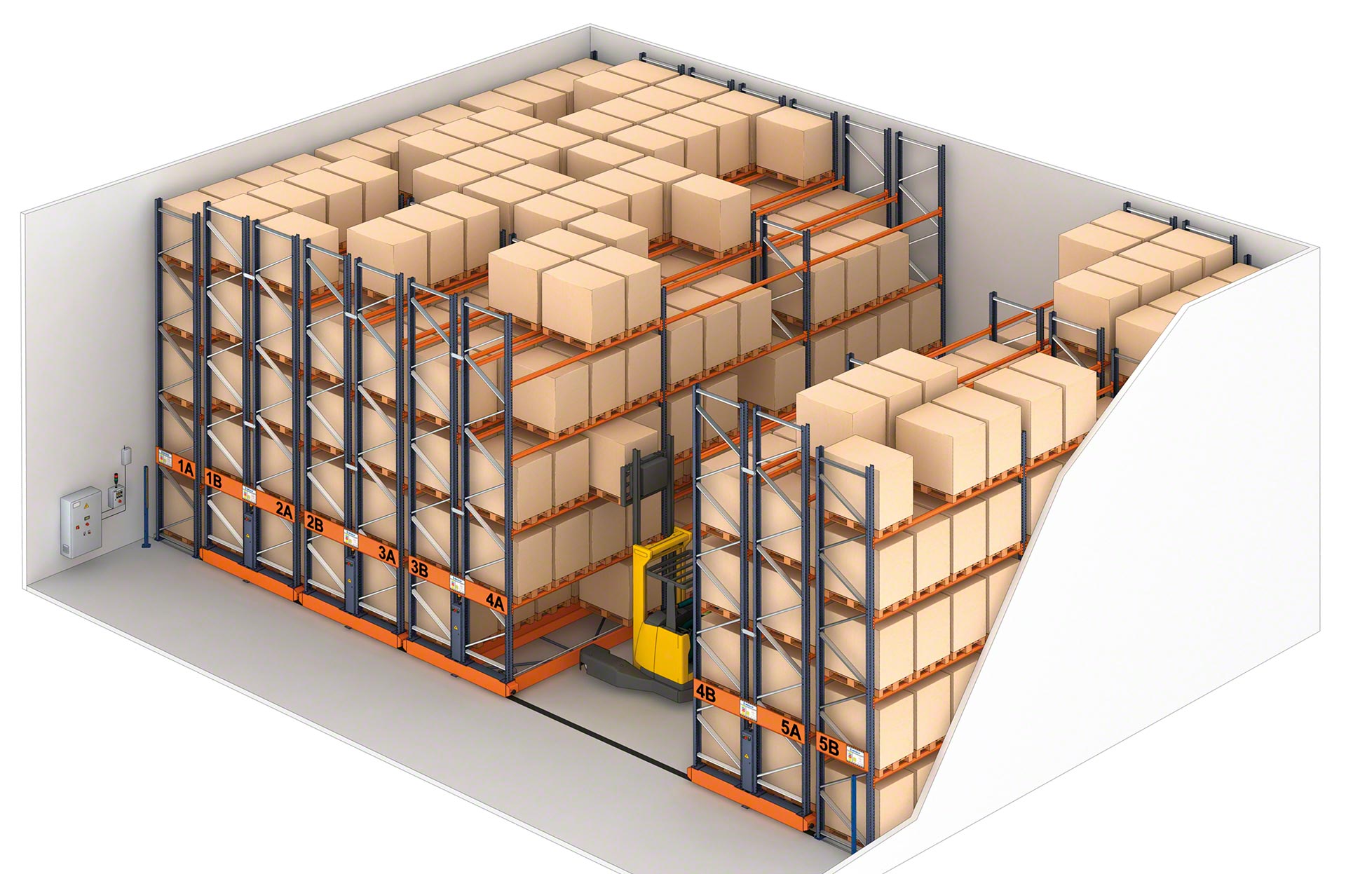Toto je rozhodnutie prijaté vo fáze návrhu. Je zrejmé, že najhustejšia skladovacia kapacita sa dosiahne konfiguráciou, ktorá umožňuje otvorenie jednej pracovnej uličky pre operácie vysokozdvižného vozíka. Ak to však zákazník požaduje, je možné súčasne otvoriť viac pracovných uličiek — aj keď za cenu zníženia počtu mobilných základní, a tým aj skladovacej kapacity.