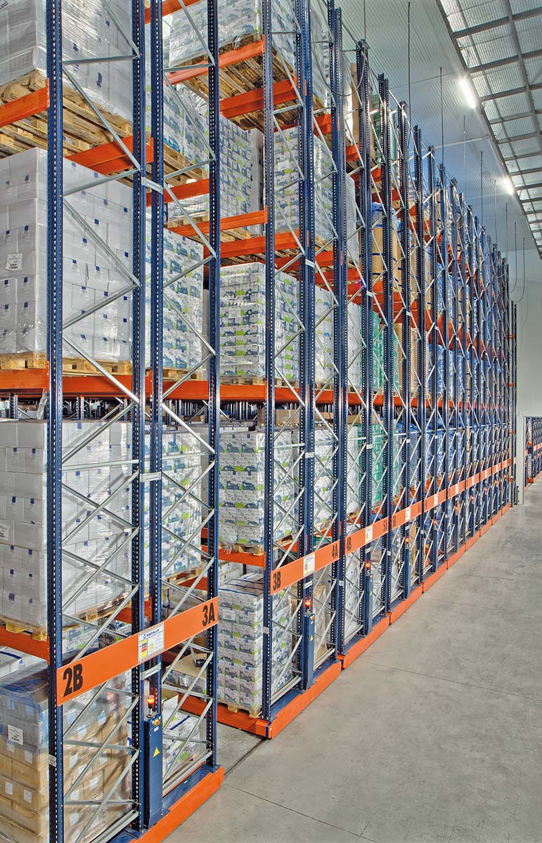 Mobilný regálový systém Movirack od Mecalux optimalizuje objem, ktorý zaberá skladovací systém. To znamená, že regálové jednotky sa spájajú alebo oddeľujú úplne kontrolovaným spôsobom a otvárajú len pracovnú uličku potrebnú v danom čase.