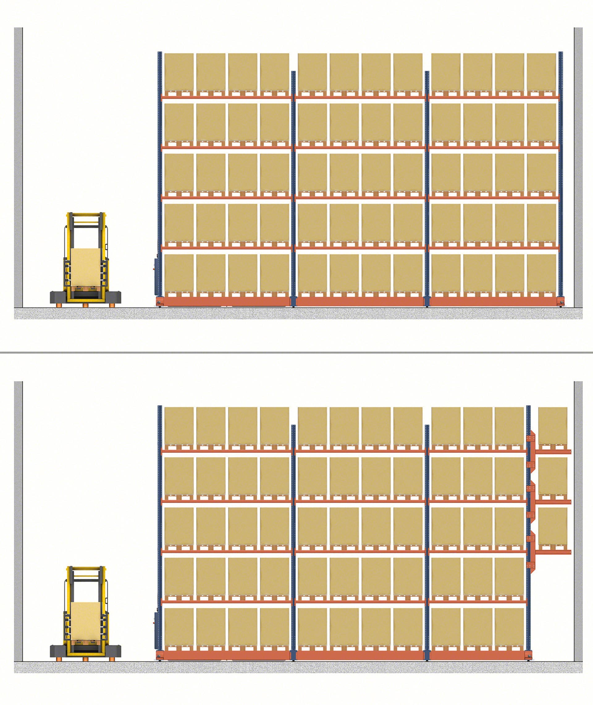 Je možné použiť akýkoľvek model vysokozdvižného vozíka s čelným nakladaním (protizávažné a retraky), pokiaľ to umožňuje šírka uličky a výška zdvihu. Najbežnejšie používané vysokozdvižné vozíky sú retraky: vyžadujú uličky užšie ako 3 m, ich výška zdvihu presahuje 10 m a ich kabíny obsluhy môžu byť tepelne chránené (veľmi užitočné pri práci v chladiarňach).